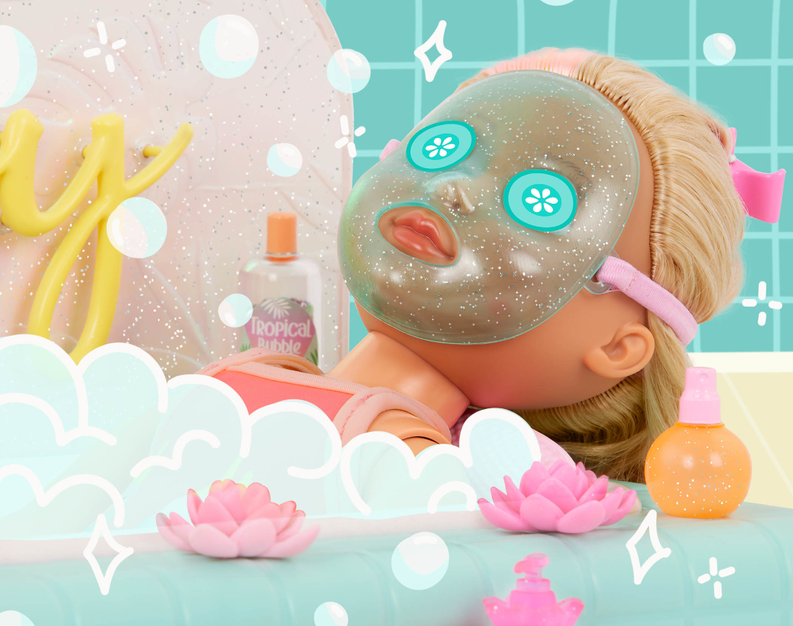 Treat dolls to a spa day with the Bubbly Bathtime Playset from Glitter Girls! This set for 14-inch dolls comes with a stylish tub, mini soaps, a towel, and a cute little face mask.