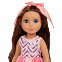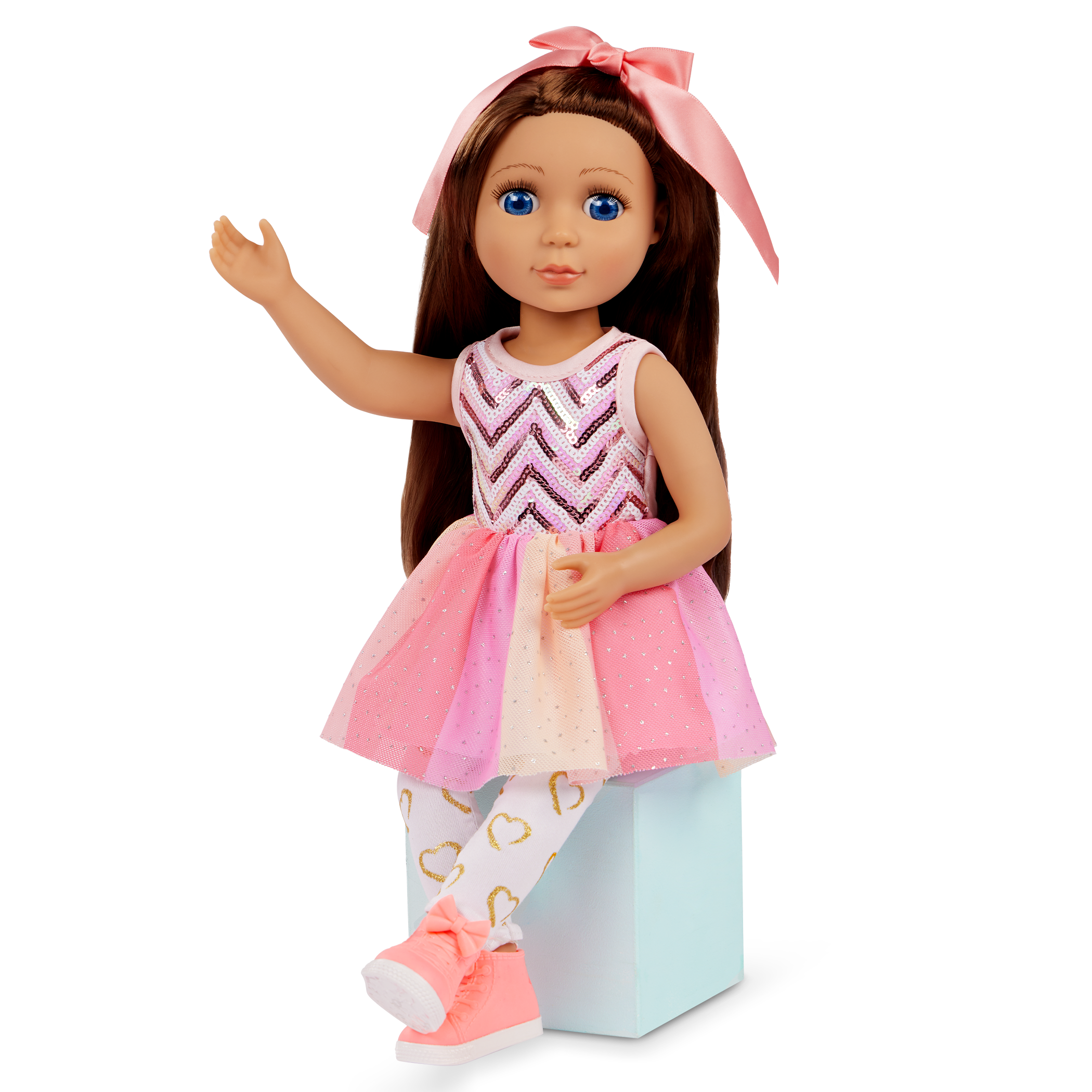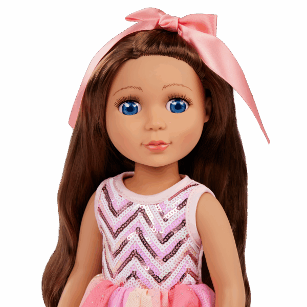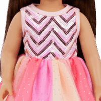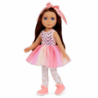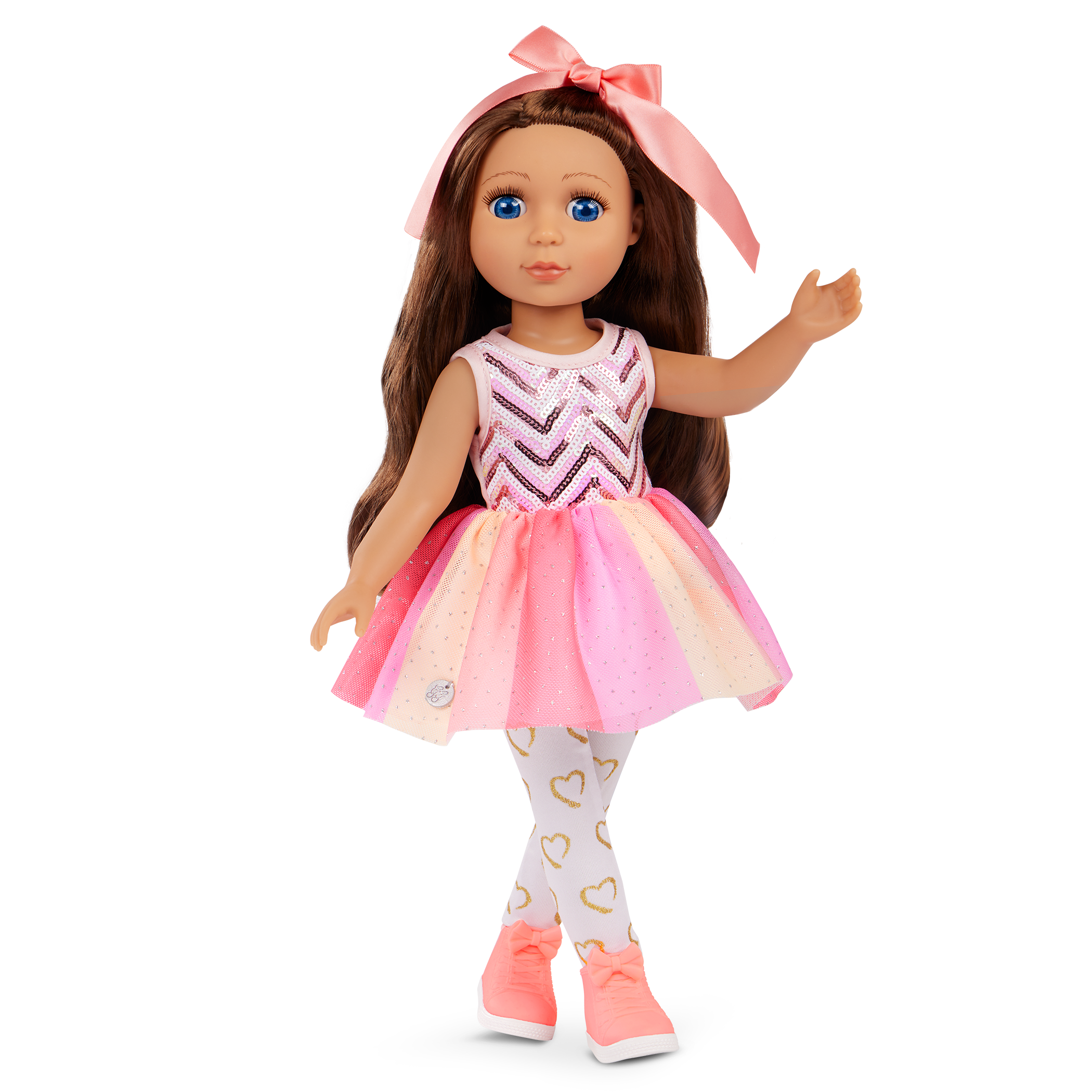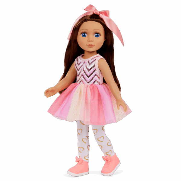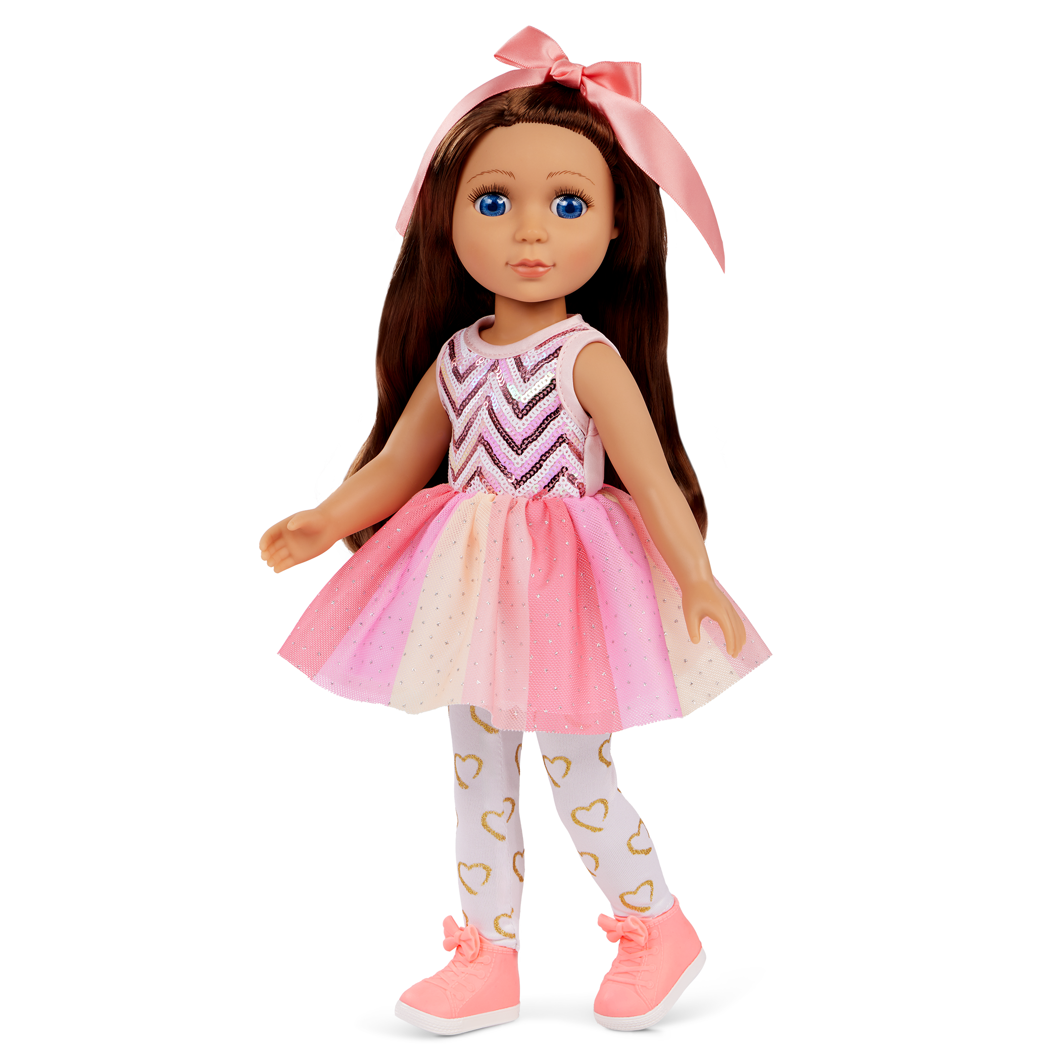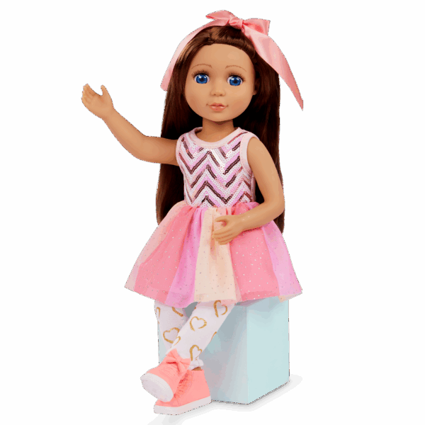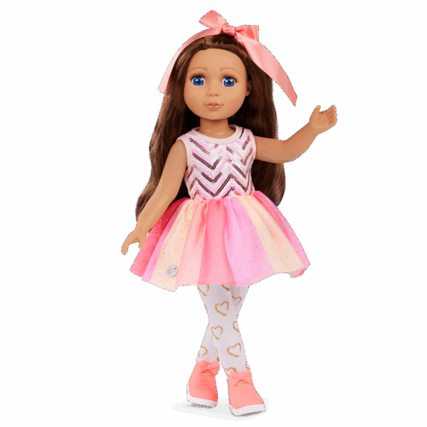 Let the good times roll with Dalia from Glitter Girls! Dalia is a 14-inch poseable doll with soft lashes, bright blue eyes, and long brown hair that’s perfect for styling. She can’t wait to rock the night away in her sparkling pastel tutu, sequin shirt, heart-print leggings, hair bow, and pink sneakers. Move her arms and legs to get groovy! Dalia is a bendable doll, so she’s always ready to strike a pose. With so many details and fun features to discover, Dalia makes the perfect gift for the little party animal in your life. Recommended for kids 3 years and up.