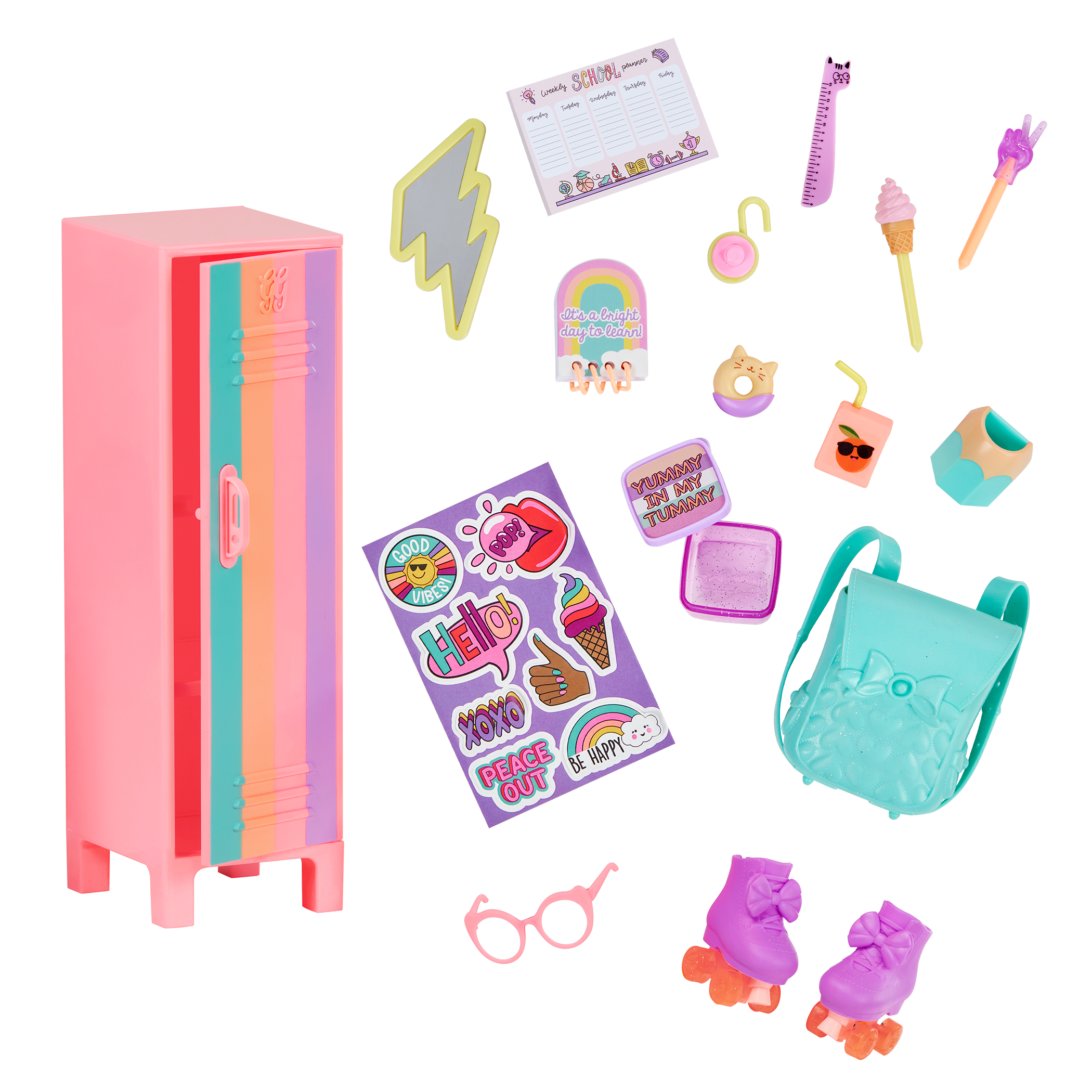 • 25-Piece Set Includes: School doll with 6-piece outfit, a backpack, a locker, a lock, a food container with lid, a stick-on pencil holder, a stick-on mirror, a juice box, a pair of glasses, a toy donut, and a set of mini school accessories.