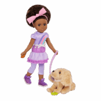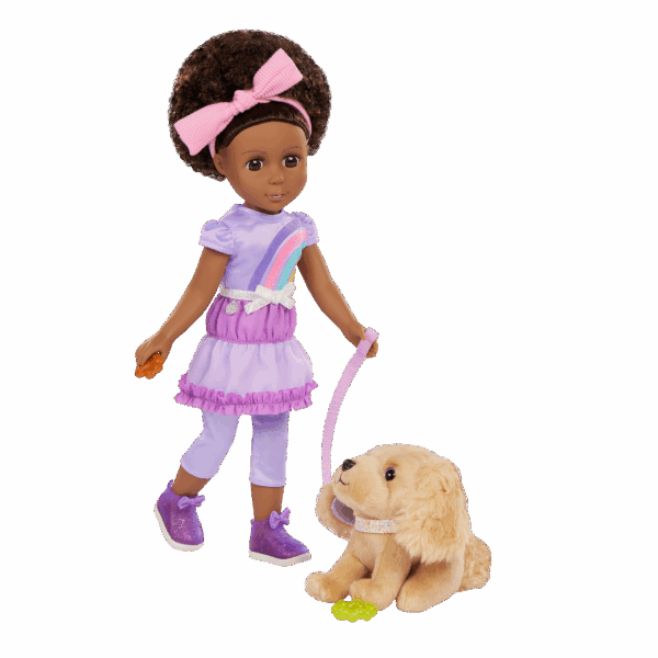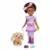 Every day is filled with magic and friendship for this sparkling pair of pals! Meet Naia & Luna from Glitter Girls. Naia has brown eyes, gorgeous long lashes, and silky-soft brown hair that’s perfect for styling. Undo her hair bow and make a new style from scratch! Naia is pretty in purple with her babydoll dress, leggings, and sparkly lavender sneakers. When she’s dressed and styled, she can strike a pose at any time – her arms and legs are posable! Is it time to take Luna for a walk? Just clip on her leash and away we go! Luna has soft, plushy fur and sparkly purple eyes. These two love to romp around and play with Luna’s chew toy and treats! There’s a glittery adventure around every corner for this 14-inch doll and puppy pair. Mix and match with all Glitter Girls dolls, playsets, and accessories! Recommended for kids 3 years and up.