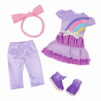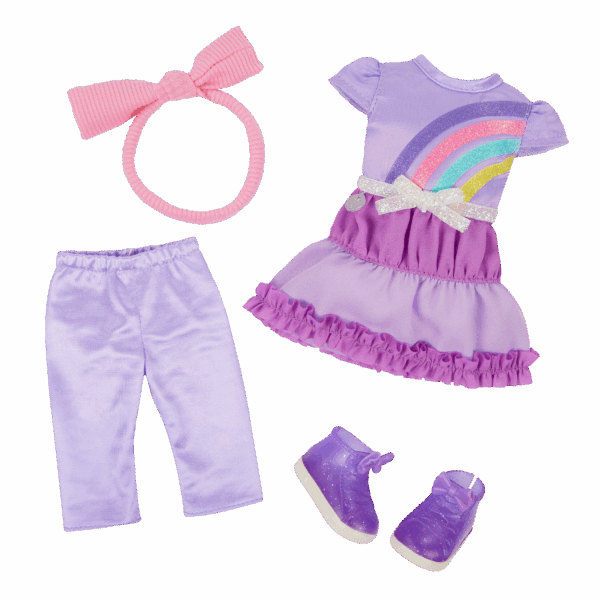 - Lavender Looks: Naia wears a purple tutu dress with a rainbow pattern, purple leggings, and high-top sparkly sneakers.