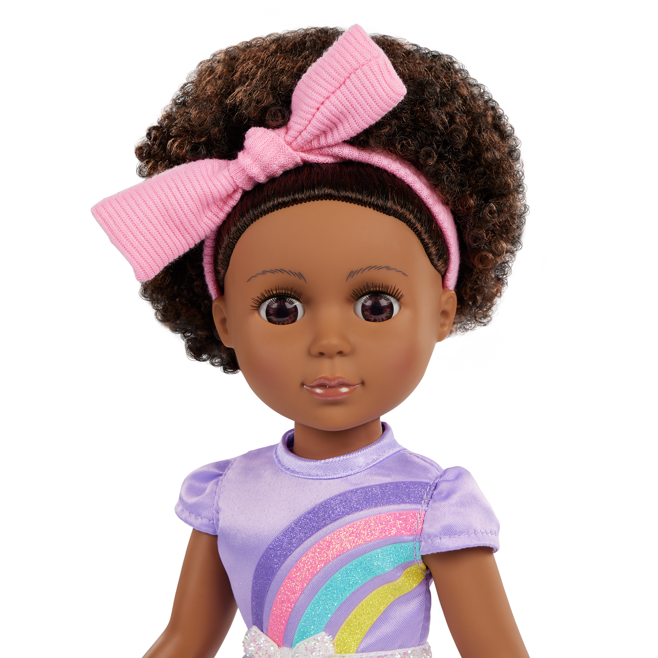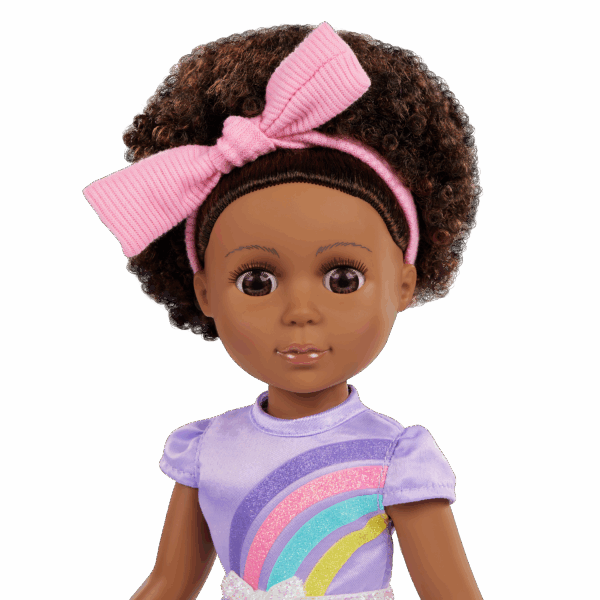 - 14-Inch Doll Naia: Naia has beautiful brown eyes, soft lashes, and brown hair pulled back with a pink bow.