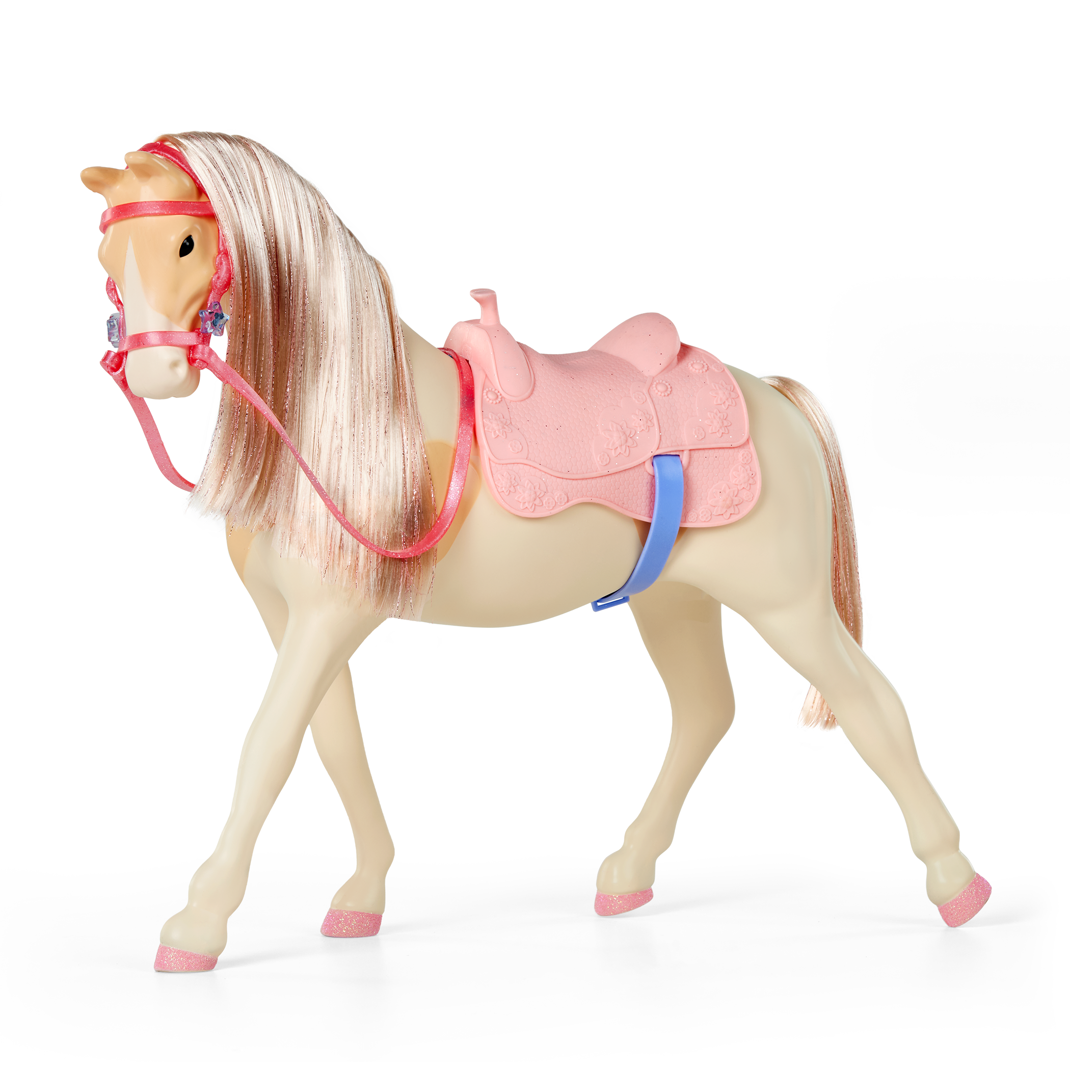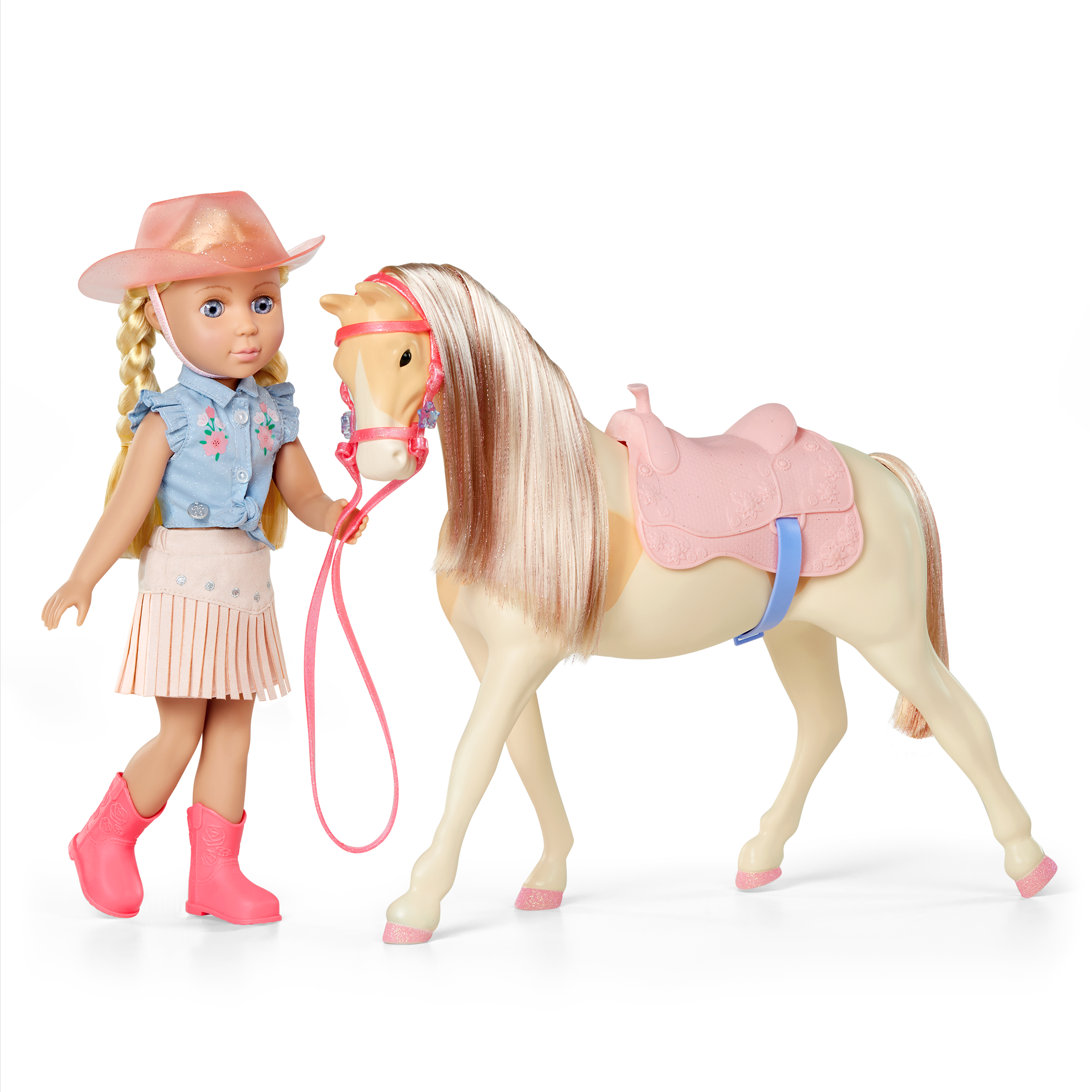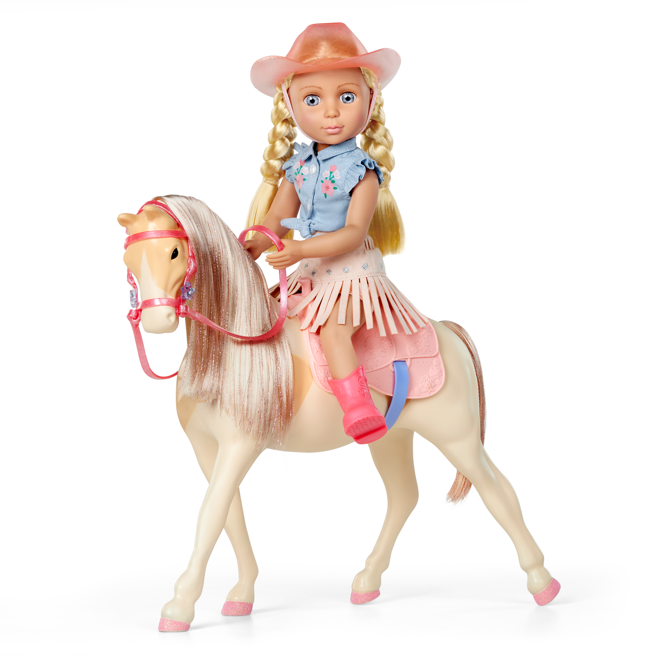 - Set Includes: 14-inch posable doll Sadie with sparkly 5-piece riding outfit and toy horse Silver, complete with a removable saddle and sparkly reins.