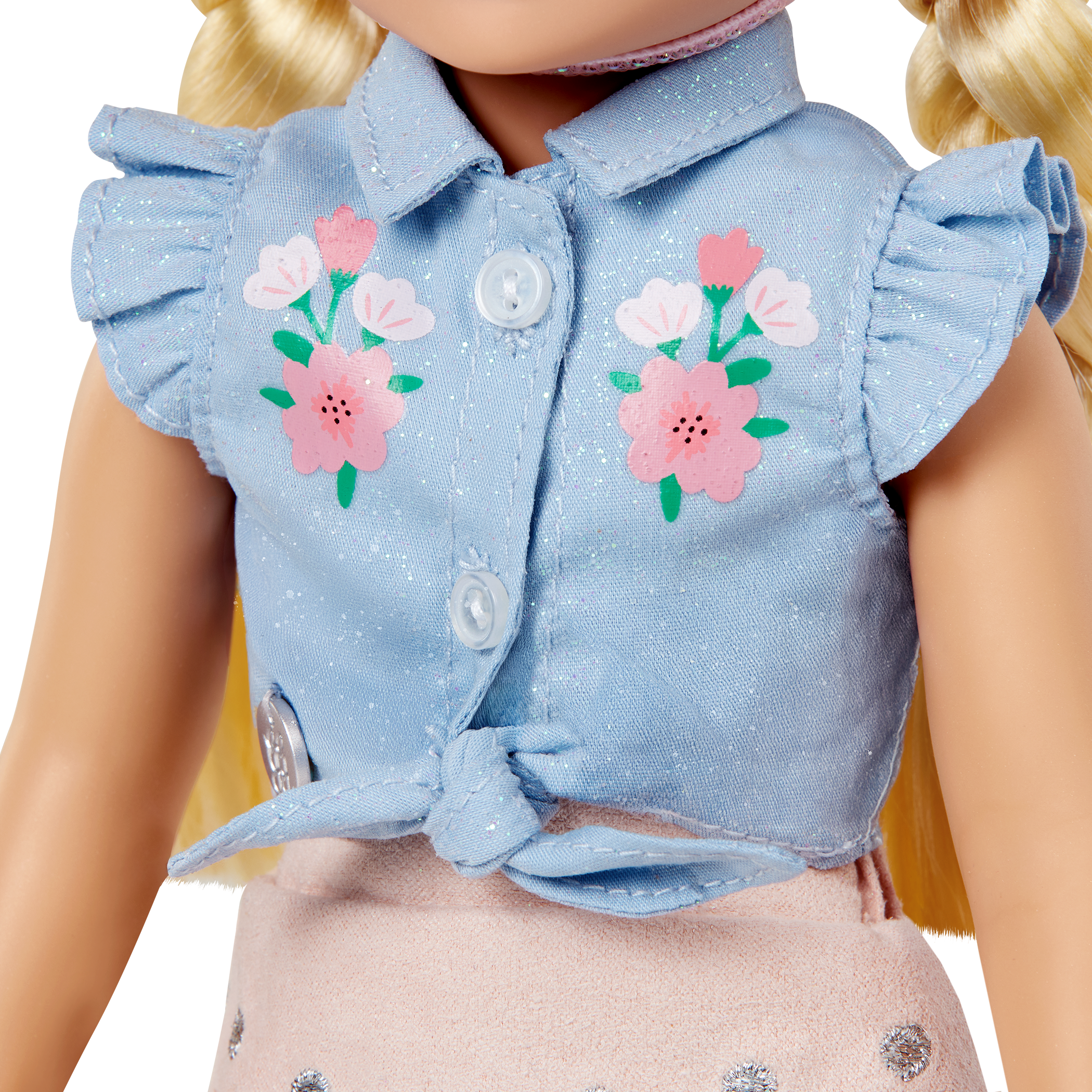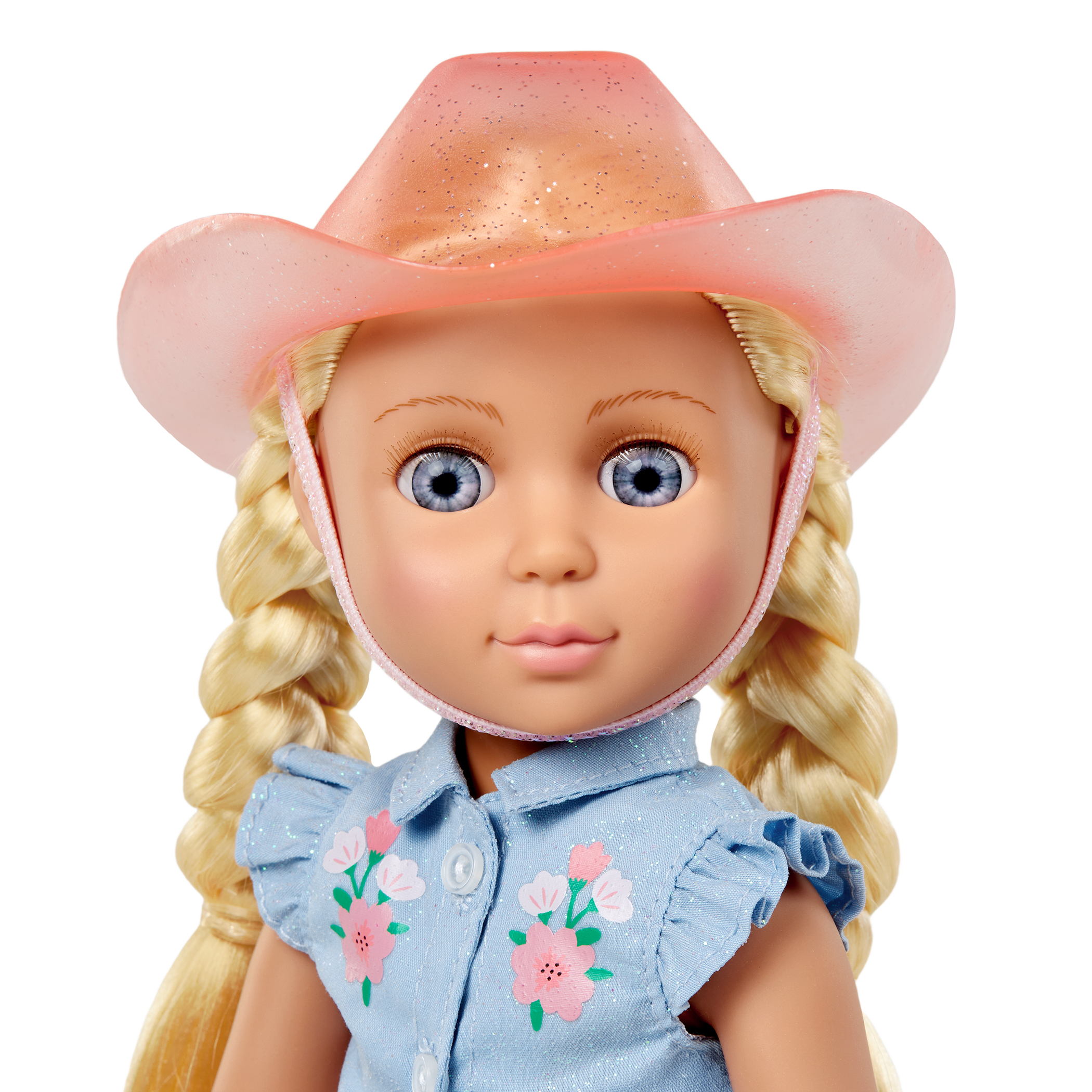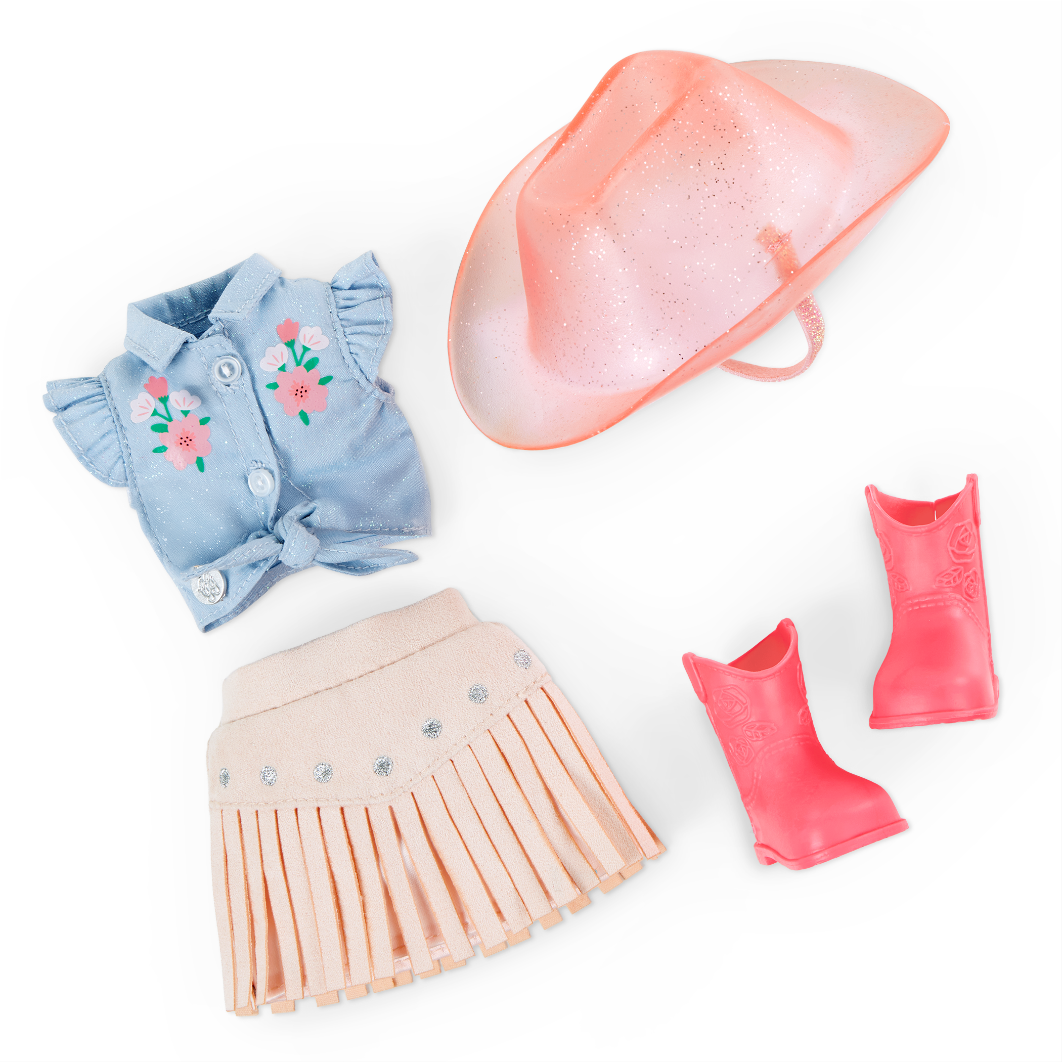- Ready To Ride: Sadie wears a stylish western outfit, complete with a blue floral blouse, fringe skirt, pink cowgirl hat, and pink cowgirl boots.