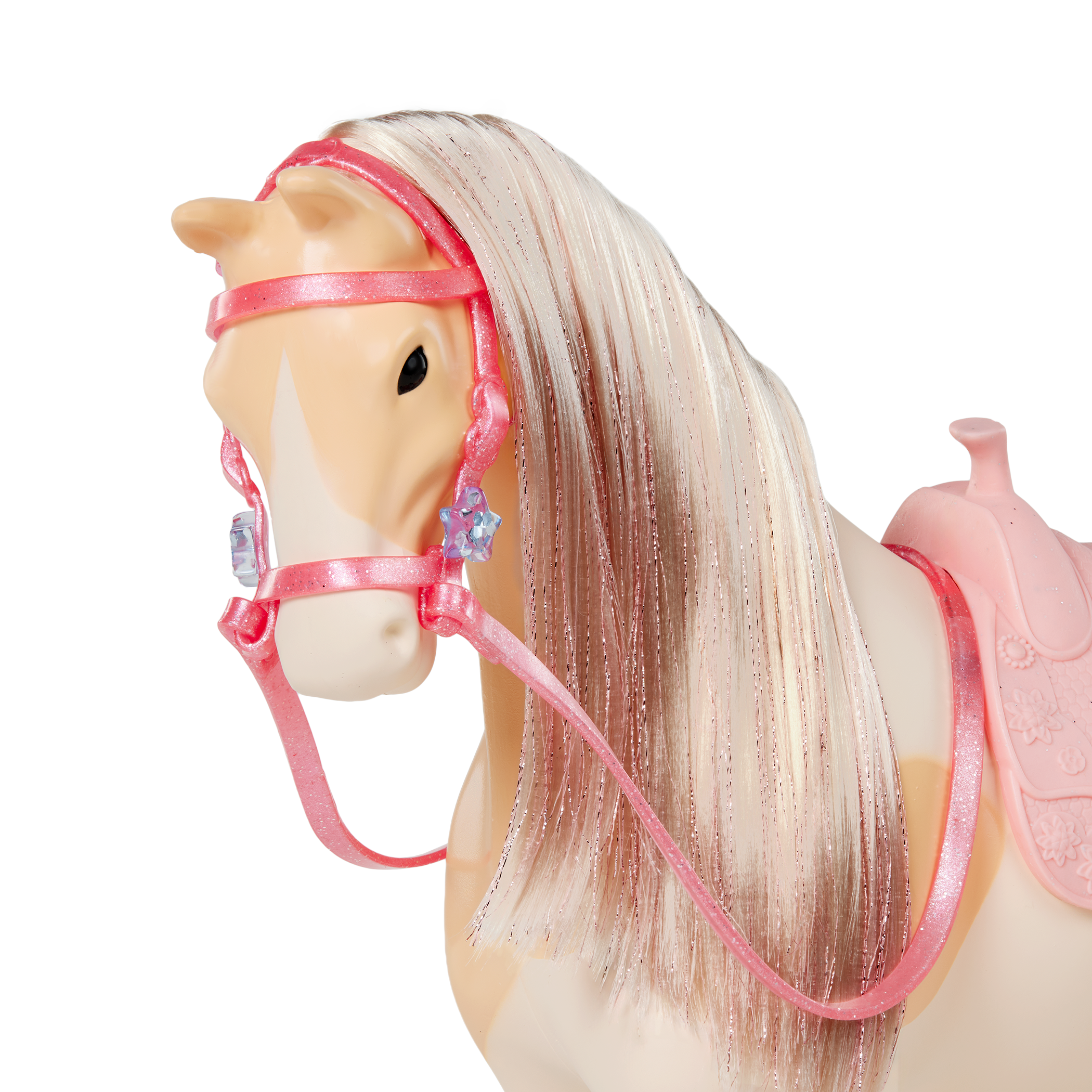 - Hold Your Horses: Silver is ready to trot into adventure with sparkly hooves, a glittery mane that’s super fun to brush and style, a pink saddle, and removable reins.