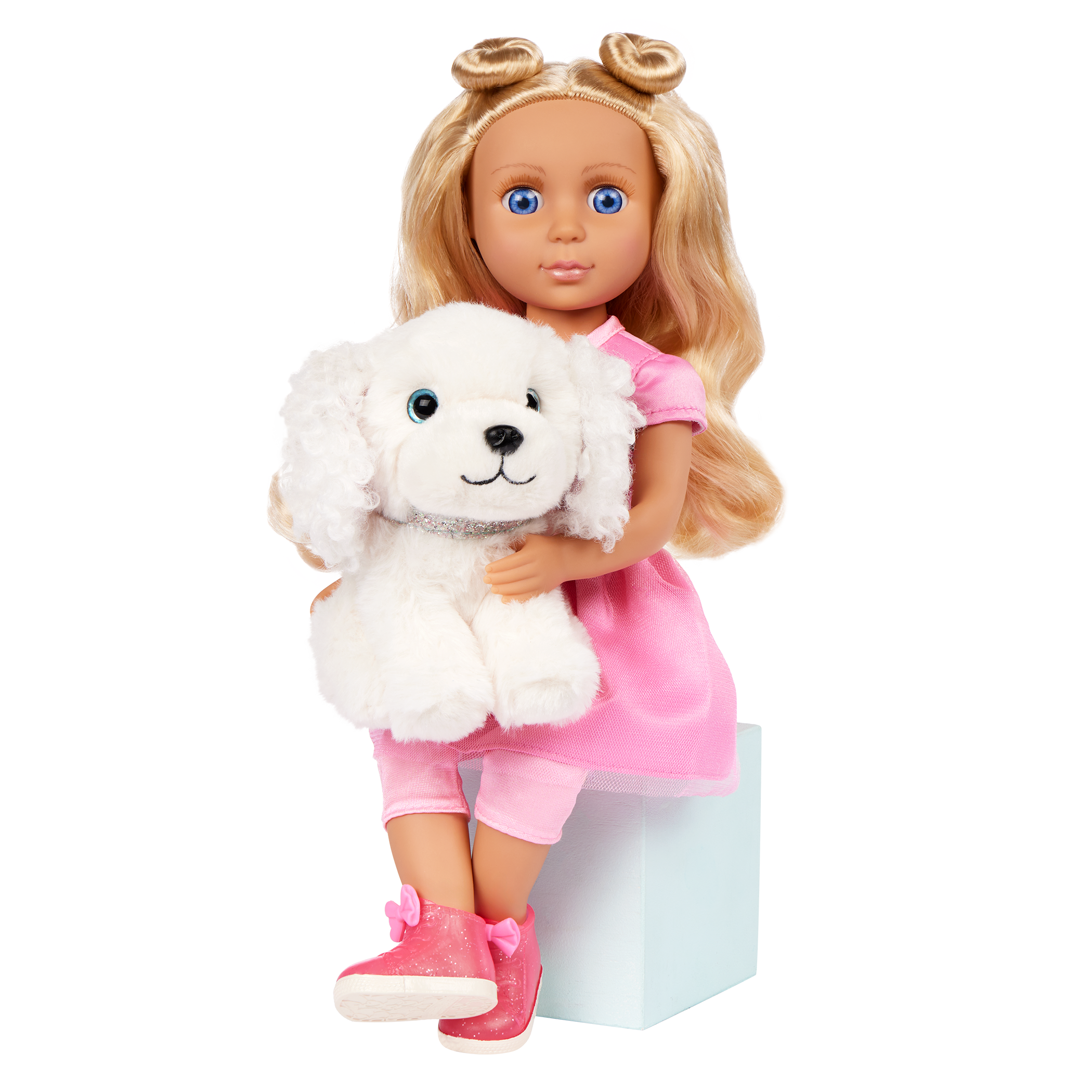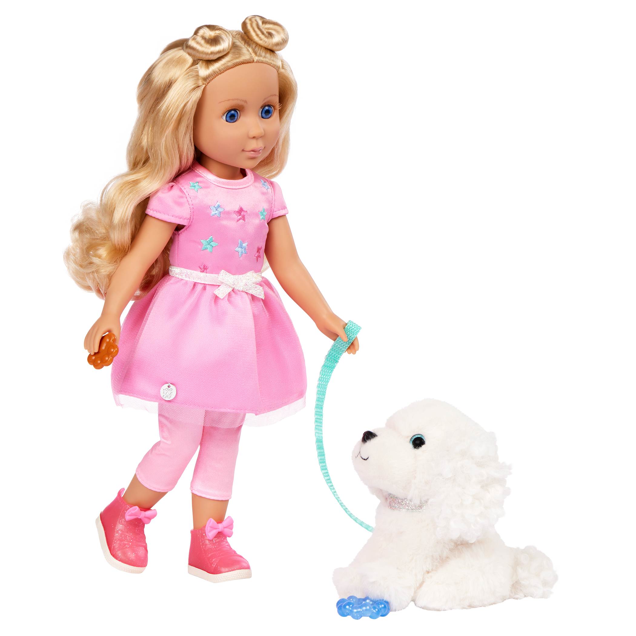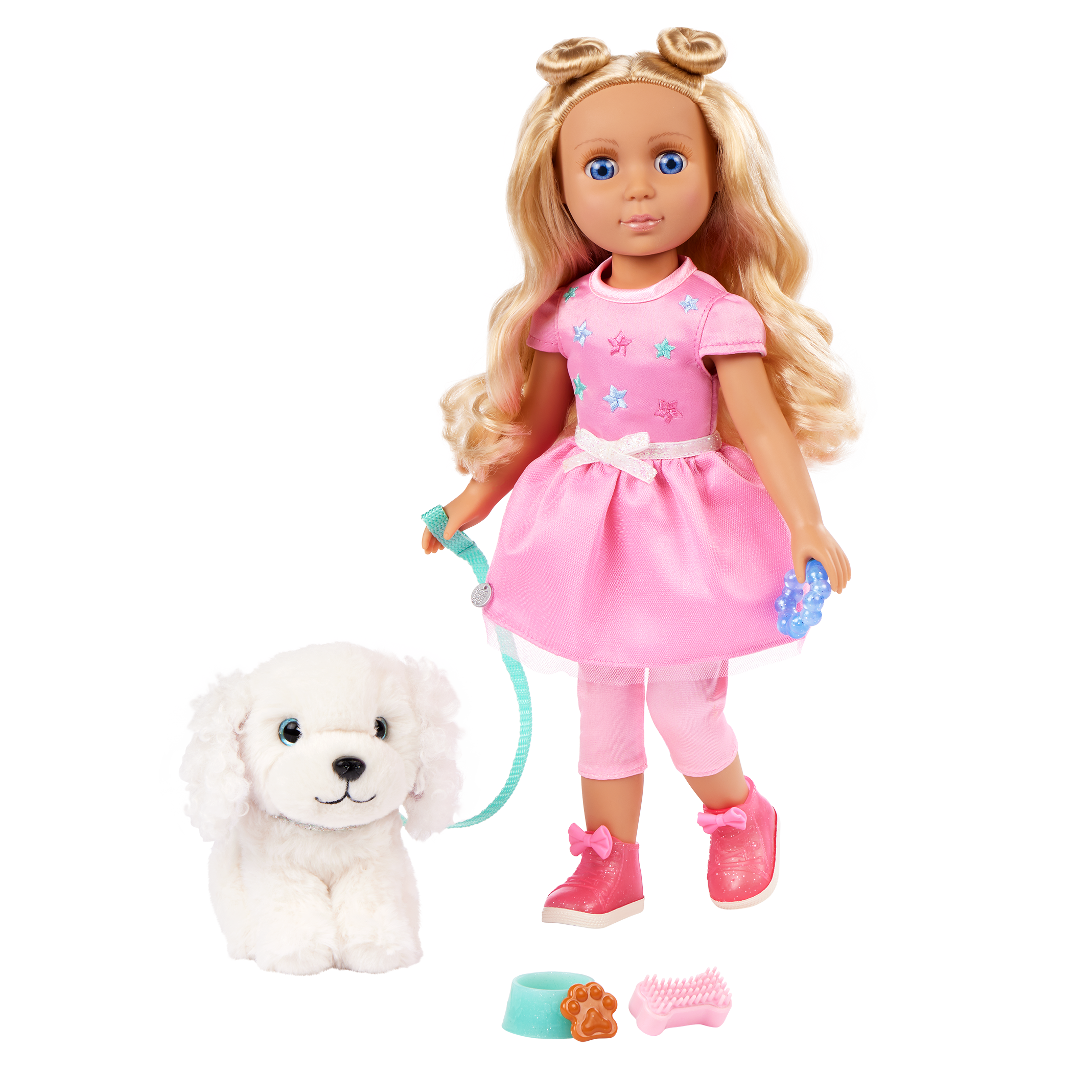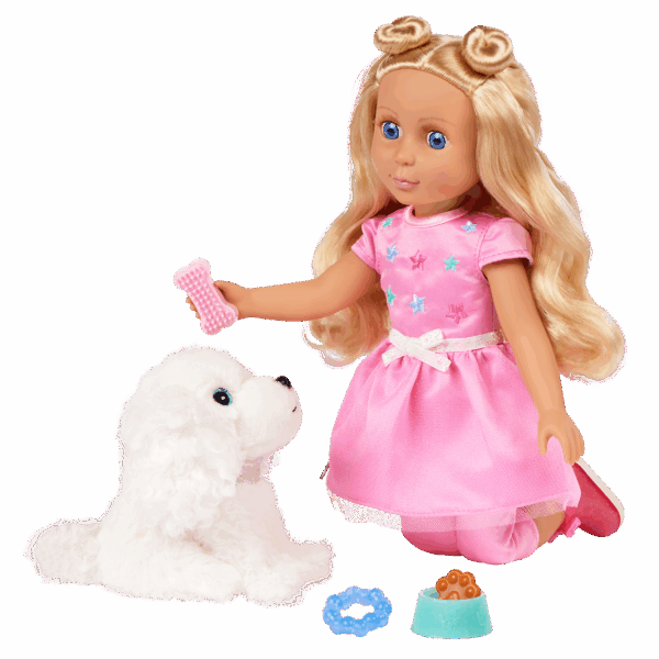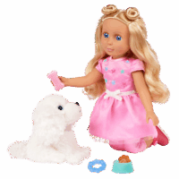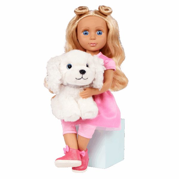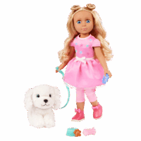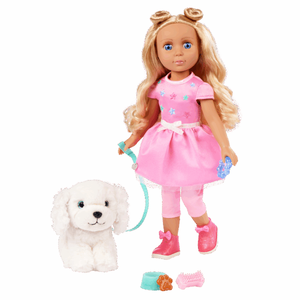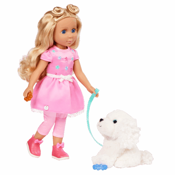 Every day is full of paw-some fun with Teri & Bibi! Teri is a 14-inch, posable Glitter Girls doll with long blond hair, soft lashes, and bright blue eyes. Undo her space buns and make a new hairstyle from scratch! Plus, her dazzling outfit has easy-open closures for endless play. Bend her arms and legs to strike a pose. Then, take Bibi for a romp at the park! Just clip on her leash and collar, and these two are ready to go. Bibi has soft, plushy white fur and is always up for adventure. This doll and plush pup set is compatible with all Glitter Girls dolls, playsets, and accessories, so kids can mix and match to their hearts’ content. Recommended for kids 3 years and up.