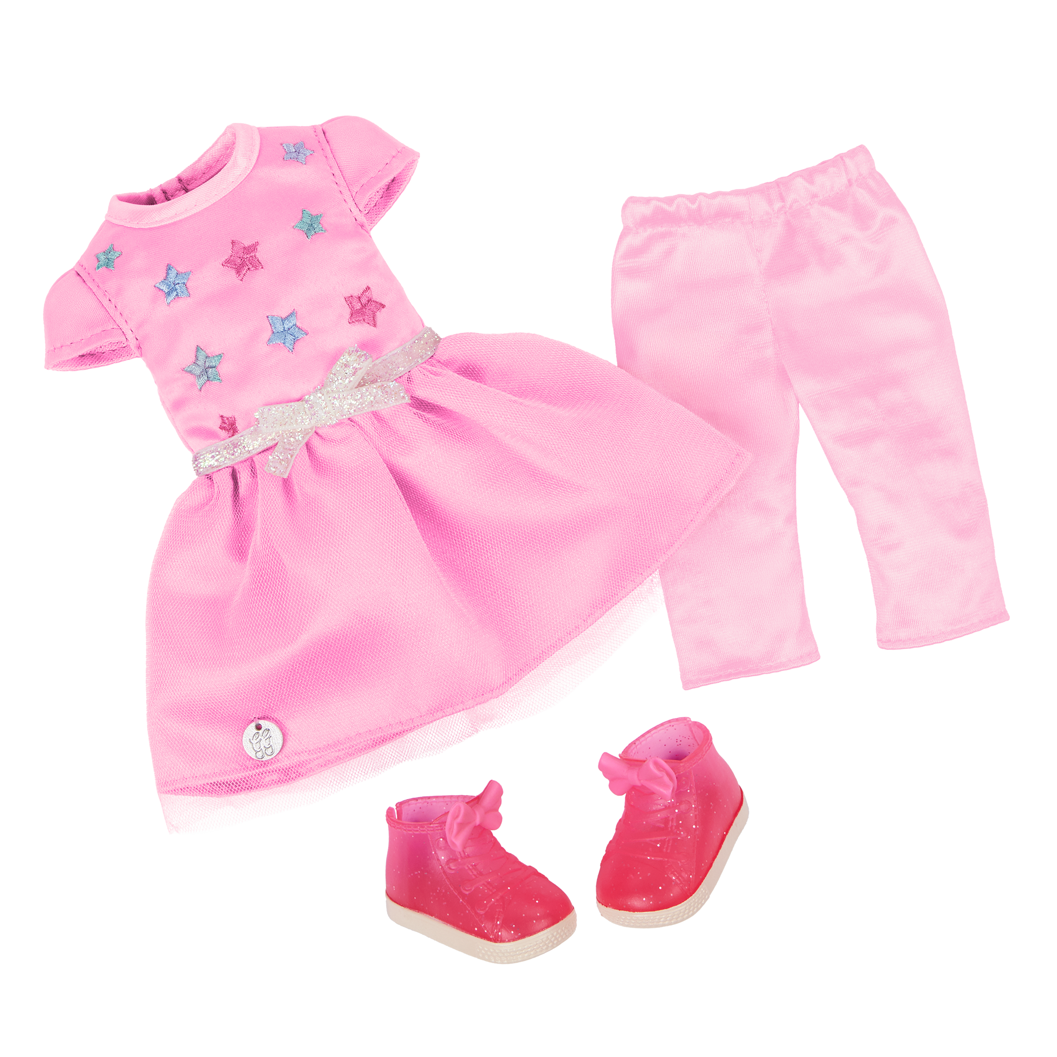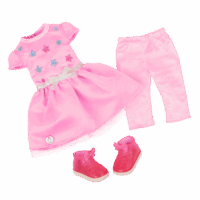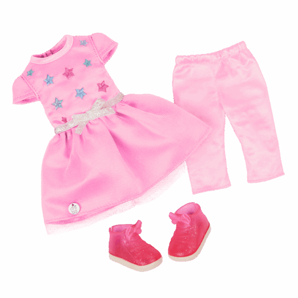 - Ready for Adventure: Teri wears a super sweet pink babydoll dress with star and bow details, pink leggings, and high-top sparkly sneakers.